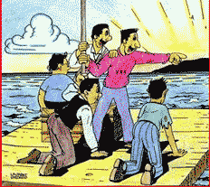 outline of a shore, the figures on the raft danced with joy.